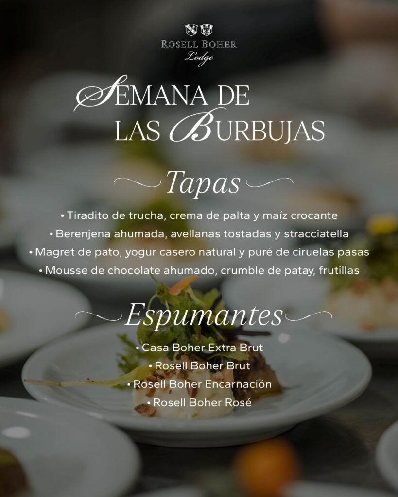 Y Rosell Boher Lodge, en Alto Agrelo, celebrará la Semana de las Burbujas, con una propuesta única de Tapas & Espumantes que cada visitante podrá maridar, multiplicando las opciones. Con reserva previa en turismo@rosellboherlodge.com
